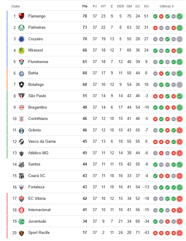 Do outro lado, o Bahia segue embalado, chega aos 60 pontos e volta a sonhar com uma vaga no G5, o que garantiria acesso direto à fase de grupos da Libertadores caso vença o Fluminense na próxima rodada.