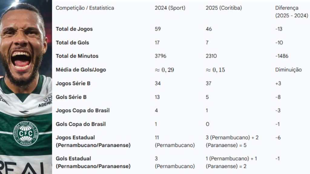 Gustavo Coutinho voltou a ser pauta – e não exatamente por bons motivos. Após uma temporada muito fraca no Coritiba, onde marcou apenas 7 gols em 46 jogos, o atacante não terá o contrato renovado e retorna ao Sport para 2026, já que tem contrato até 2027. O contraste com 2024 é gritante: foram 17 gols pelo Sport, quase o triplo do rendimento no Coxa. A média também despencou: de 0,29 gol/jogo para apenas 0,15.
